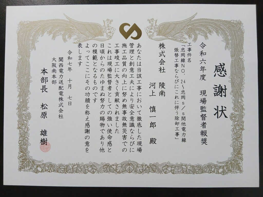 このたび、当社 株式会社陵南の河上慎一郎が、関西電力送配電株式会社 大阪南本部様より「令和6年度 現場監督者報奨 感謝状」を拝受いたしました。